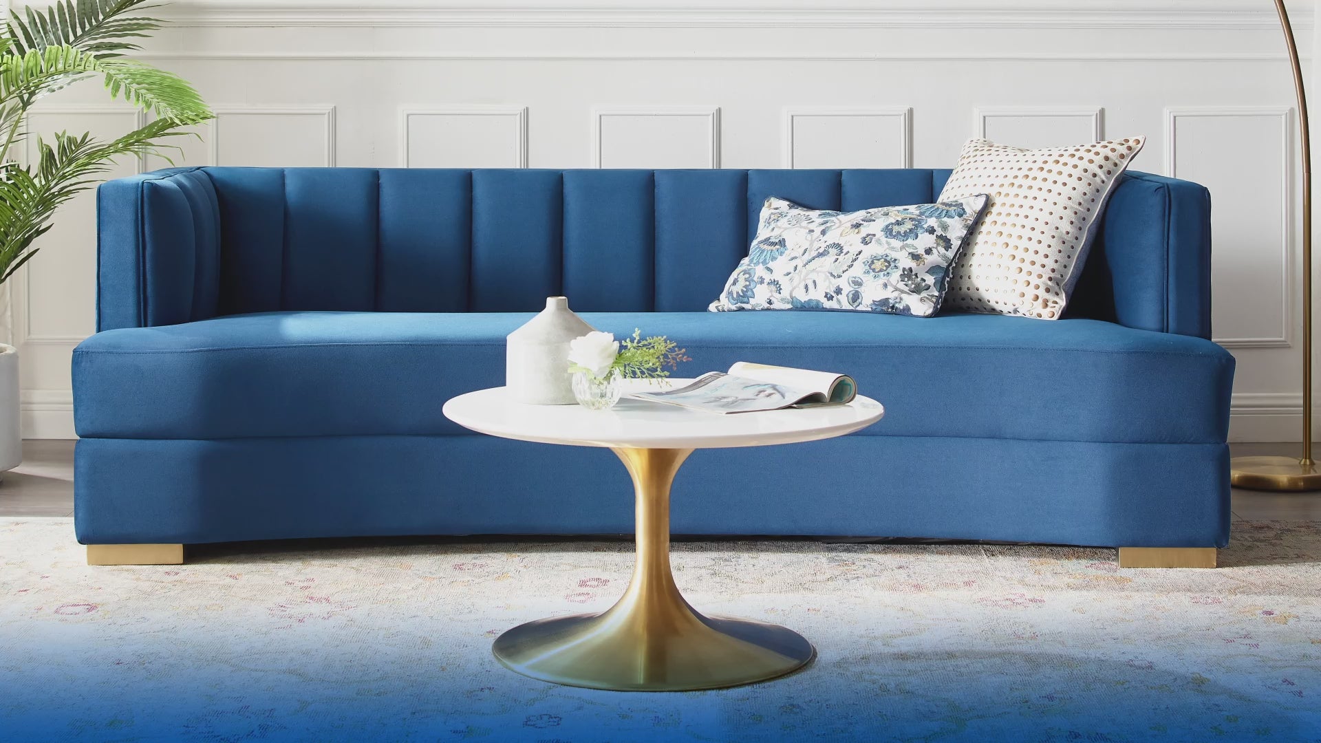 Bring the Encompass Curved Channel Tufted Performance Velvet Curved Sofa to your living room and claim center stage with the glam deco elegance. Encompass has a linear back and arms enhanced with interior vertical channel tufting accents. The curved seating expanse adds a welcoming appeal to the velvet couch. The Encompass Living Room Sofa has densely padded foam cushions covered with luxuriously soft stain-resistant performance velvet polyester upholstery creating a lushly comfortable seat. Four gold stainless steel legs with non-marking foot caps support the Encompass Couch. Assembly Required. Sofa Weight Capacity: 600 lbs.