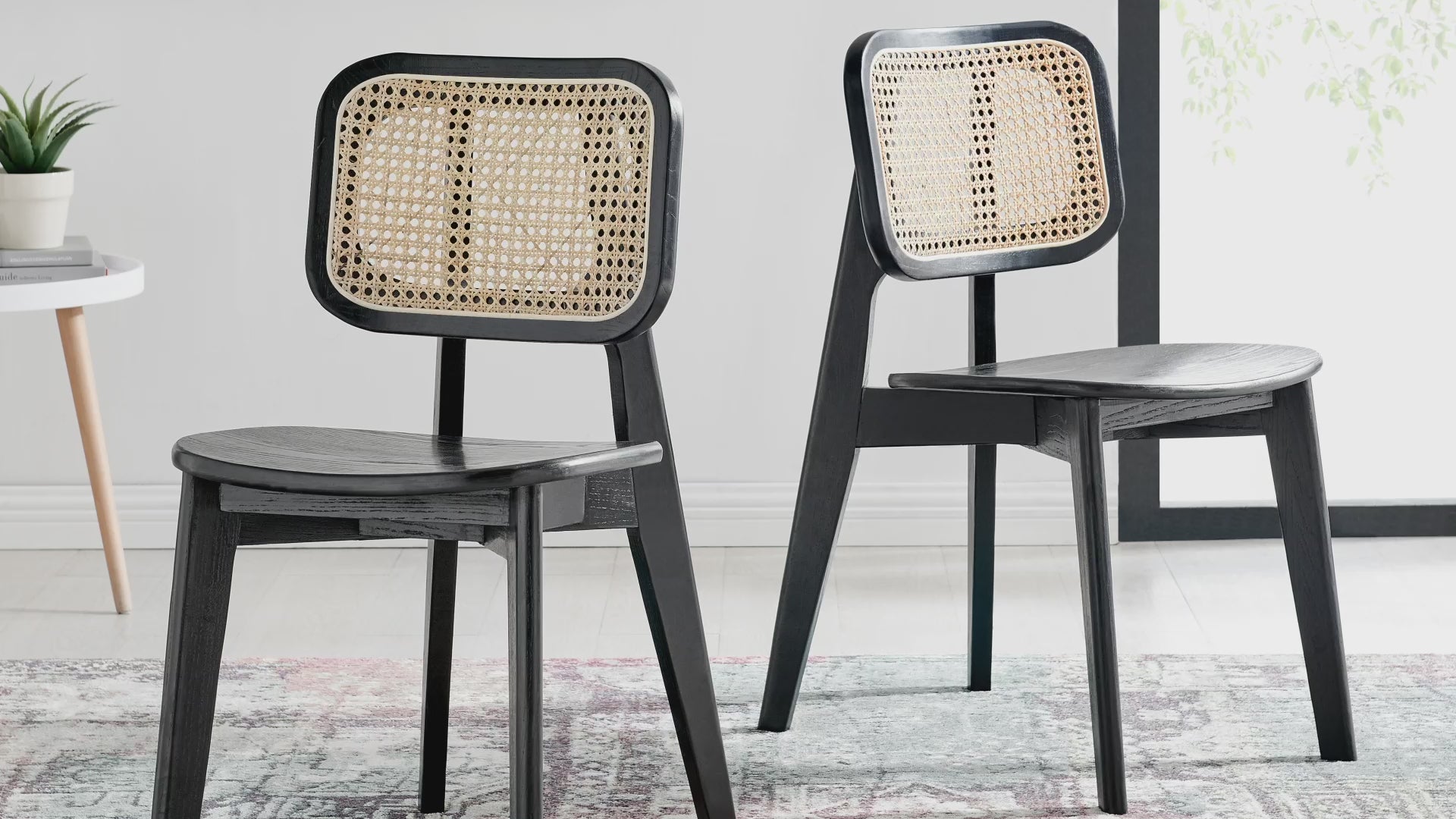 Bring coastal charm and modern farmhouse style to your dining space with the rounded edges and airy design of the Habitat Dining Chair Set. With a frame crafted from solid elm wood, this dining chair set features a woven rattan cane backrest and bentwood seat with a beautiful wood grain veneer to match. These versatile chairs makes a statement around the dining table or as accent chairs in the living room, office, entryway, or other sitting area. Includes non-marking foot caps. Weight Capacity: 330 lbs.