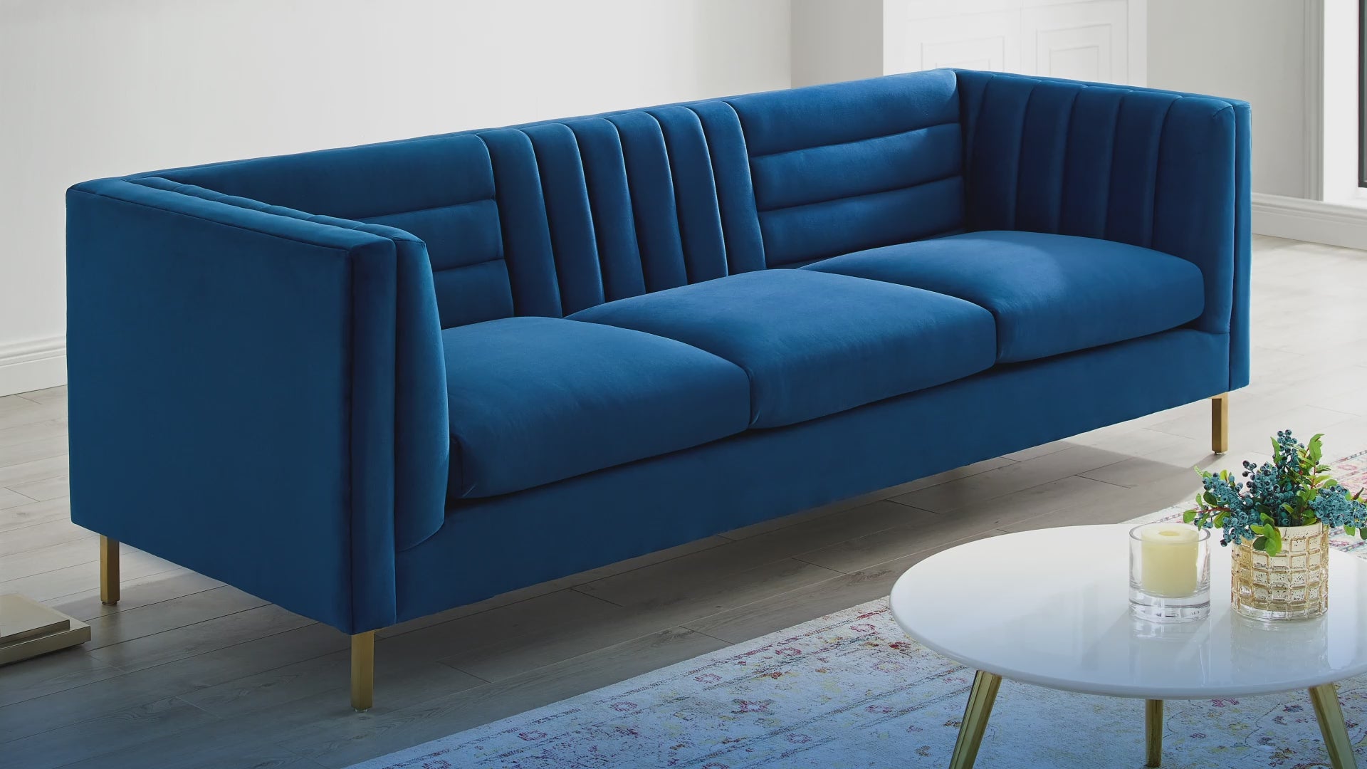 Regale visitors from the exquisite comfort of Ingenuity's luxe perimeters. This retro-modern sofa features a visually contrasting channel tufting that introduces an energetic and lively welcome for your living room or lounge area. Soft, stain-resistant performance velvet upholstery covers the sofa's solidly constructed wood frame. Ingenuity features dense foam cushions for a premium seating experience. Four stylish gold stainless steel legs offer solid support in this comfortable centerpiece for the modern home.