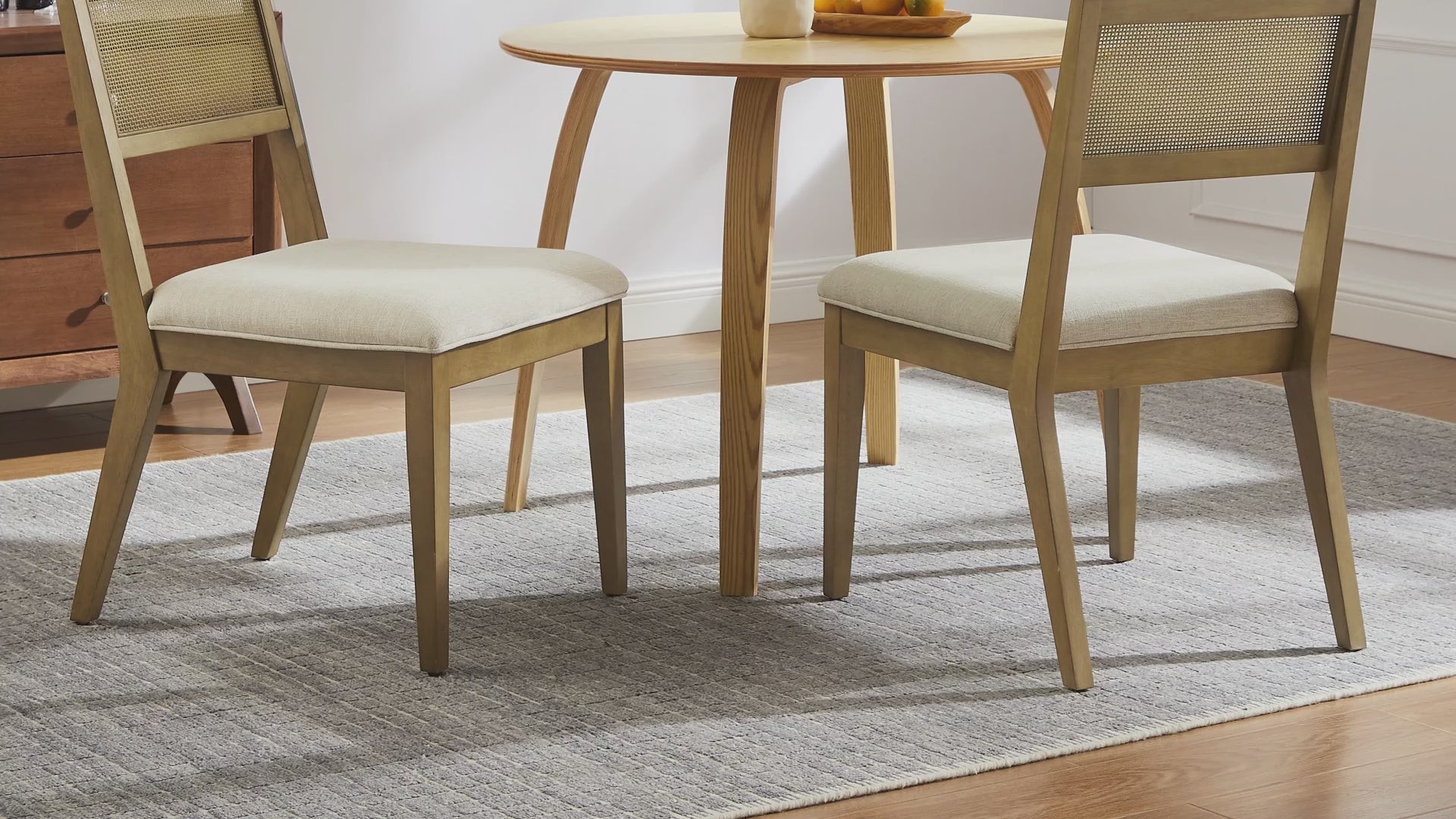 Experience the blend of natural textures and contemporary flair with the Nimba Wood Dining Chairs. Set on a solid rubberwood foundation, these mid century modern dining chairs showcase the inviting warmth of natural wood. The seats, upholstered in woven heathered fabric and padded with foam, provide cozy and supportive comfort, are ideal for extended periods of sitting, whether for dining or conversation. A backrest accented with a faux rattan weave gracefully tops off the design, entwining with the rattan chair's wooden frame to create a continuous and chic aesthetic. Tapered legs enhance the modern farmhouse chair silhouettes, complemented by foot glides for floor protection. These armless cane back dining chairs promote a clean, uncluttered look, perfect for any dining setting. The set includes two wood dining accent chairs with cane back for a cohesive dining experience. Weight Capacity for Each Side Chair: 507 lbs.