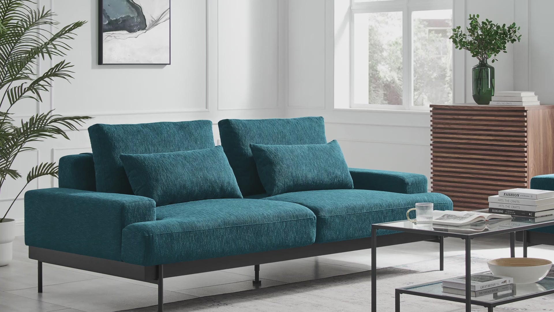 Dive deep into casual design and modern minimalism with the Proximity Fabric Upholstered Sofa. Upholstered in soft yet durable polyester fabric, this sofa features a tailored silhouette, deep, comfortable seats, and sleek lines for a retro modern look that complements a variety of living spaces. Resting on a solid wood frame with powder-coated metal legs and non-marking foot pads, this three-seater sofa is complete with dense foam padding and a sinuous spring support system to offer a premium seating experience. This upholstered sofa is the perfect addition to a living room, lounge area, home office, or bedroom sitting area. Assembly required. Weight Capacity: 992 lbs.