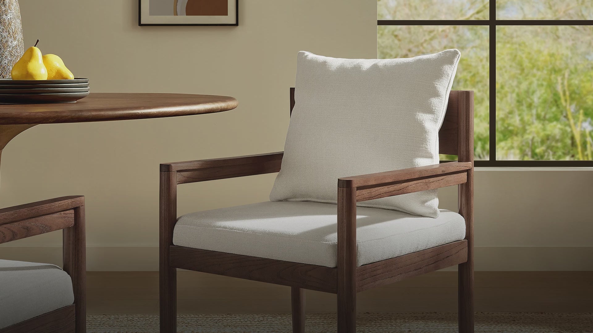 Blending modern elegance with modern comfort, the Remington Bar Stool offers a refined seating experience at your bar or high-top table. This 29-inch bar height stool features a solid elm wood frame with a rich finish, showcasing clean lines, an open back, and integrated armrests. A foam-padded seat and removable back pillow are wrapped in textured slub weave fabric for a soft, supportive feel. Tapered legs bring a Scandinavian touch, with a built-in footrest ensure durability and stability. Non-marking foot glides protect floors are included. Whether styled at a home bar, kitchen counter, or high-top dining area, this modern bar height chair enhances any contemporary setting. Weight Capacity: 300 lbs.