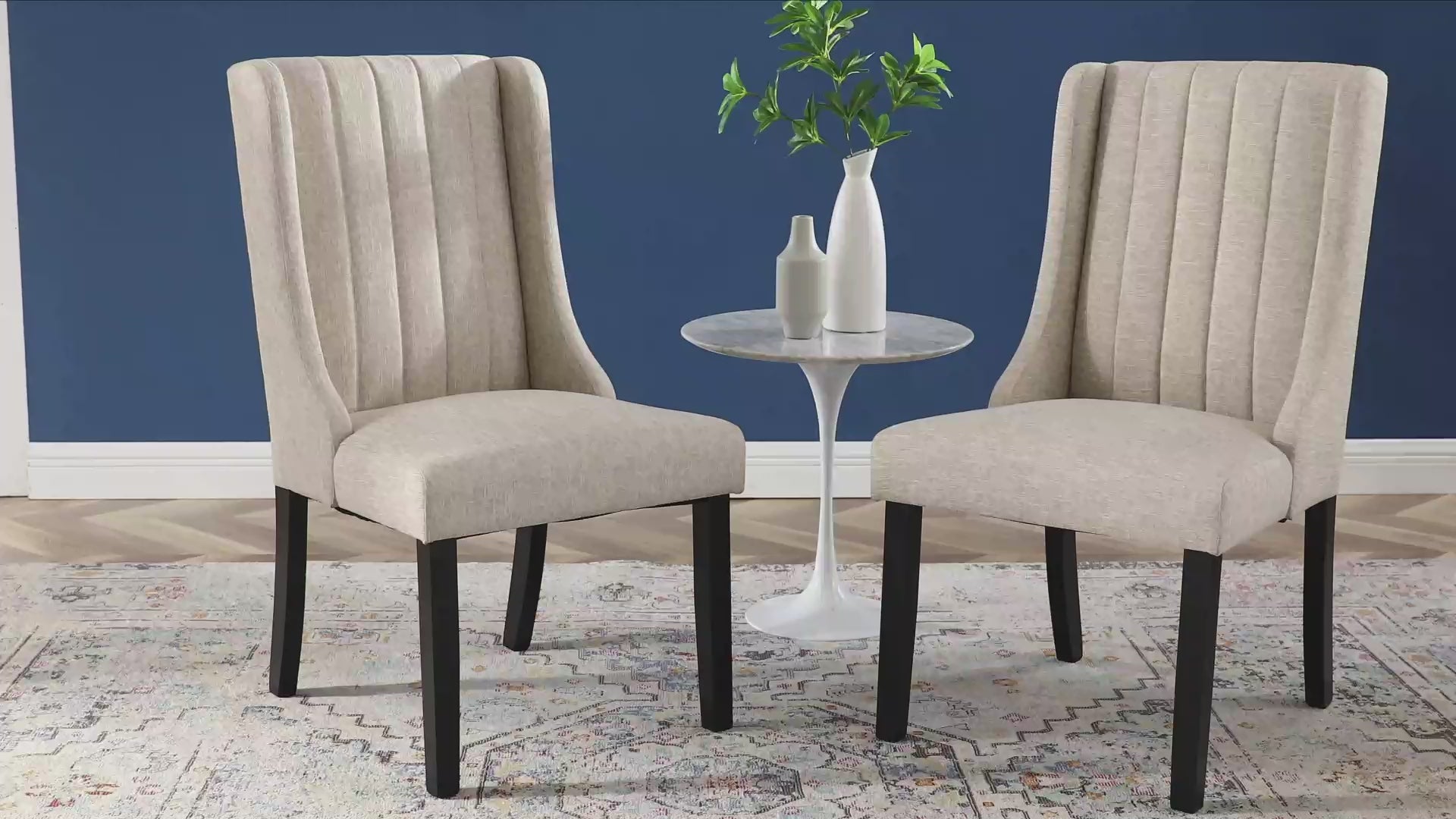 Revitalize your dining space with the Renew Fabric Dining Chairs. A set of two, these Parsons dining chairs bring glam deco style to your dining space with soft fabric upholstery and channel tufting. This fabric dining chair set features a sturdy rubberwood and MDF construction with dense foam padding and spring support system to offer a premium seating experience that encourages relaxation and conversation. Resting atop four black legs with plastic foot glides to prevent damage to flooring, these tufted accent chairs make a striking statement in the dining room, kitchen, living room, office, or other seating area.