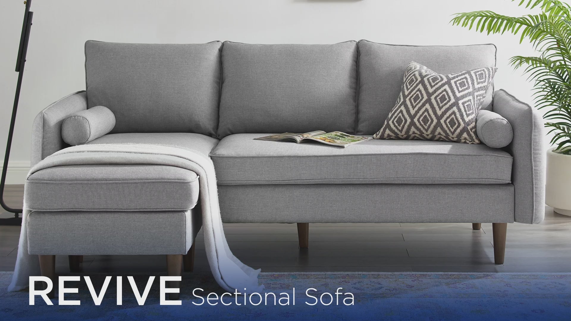 Give new vitality to your living space with the Revive Upholstered Fabric Right or Left Sectional Sofa Sectional Sofa. With a comfortable yet tailored profile and two bolster pillows, Revive Living Room Couch beckons guests to sit and stay a while. Dense foam padding and a pocket coil spring system provide a luxurious seating experience. Soft polyester fabric upholstery grants this three-seater sectional sofa with a right or left facing chaise an approachable appeal that’s echoed by its calming color, clean lines, and splayed and tapered wood legs with non-marking foot caps. The Revive Right-Facing Sofa has a built in ottoman that allows for a variety of comfortable lounging combinations and accommodates a multiple decor styles in your living room, lounge room, or other seating area. Weight Capacity: 900 lbs.