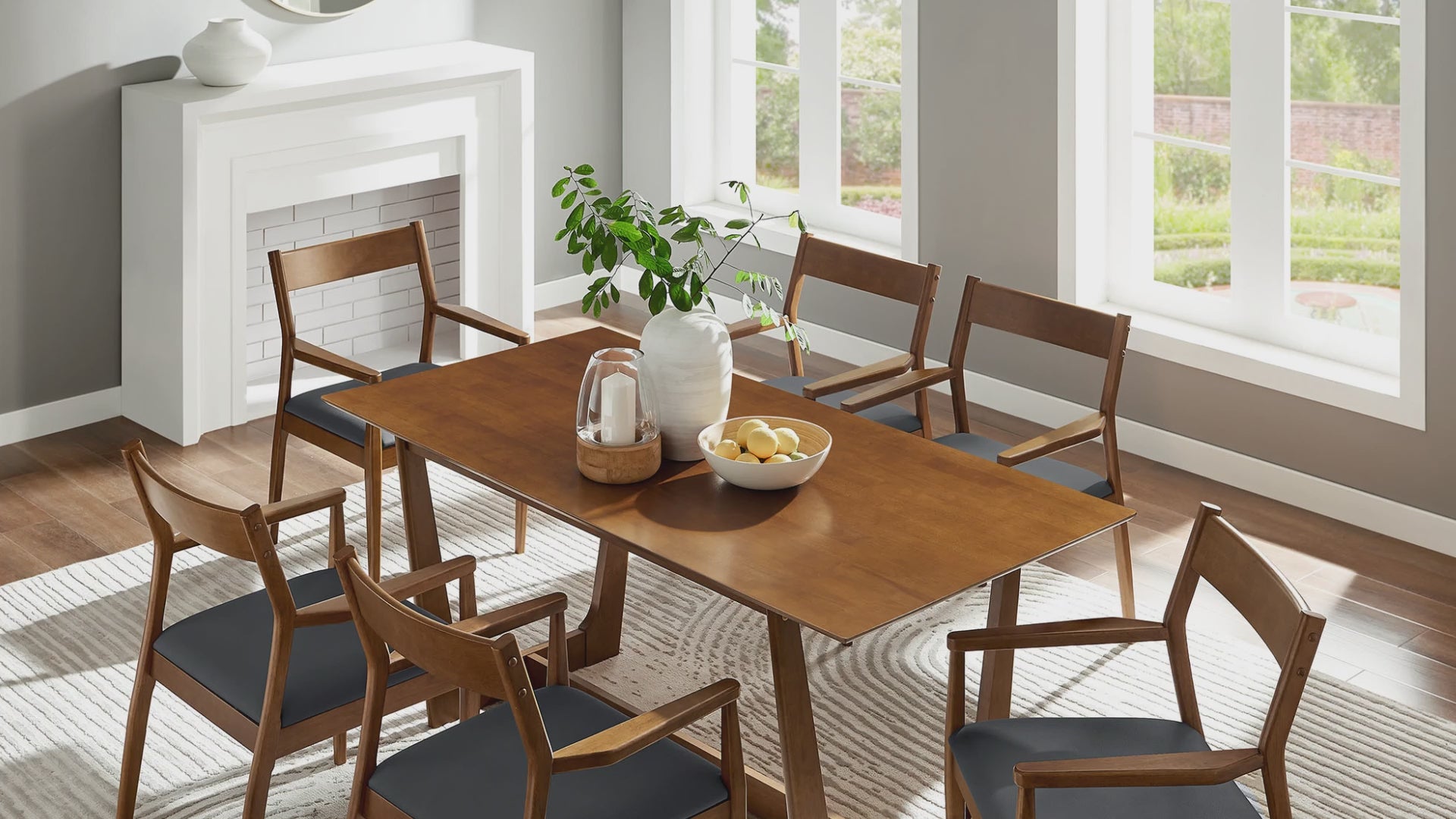 Adorn your dining space with the Solara Vegan Leather and Wood Dining Armchairs. This set of 2 dining accent chairs is crafted from premium rubberwood with a natural wood finish that highlights the rich grain patterns, offering a warm, inviting seating option for meals and gatherings. Designed with a faux leather upholstered seat, these furniture chairs combine comfort with a stylish, sustainable design. Standing on sleek, modern legs that taper gracefully to the floor, the Solara dining table chairs are minimalist yet sturdy. The slim and mid-century modern design of the backrest and arms adds to their simple, sophisticated silhouette, allowing them to easily fit into any contemporary decor. Ideal as both wood kitchen chairs or dining room table chairs, these comfortable faux leather chairs set of 2 can also serve as stylish office chairs for your study. Make the Solara Minimalist Chairs your go-to cushioned dining armchairs, combining mid-century modern beauty with everyday practicality. Assembly is simple with clear instructions. Weight Capacity: 507 lbs.