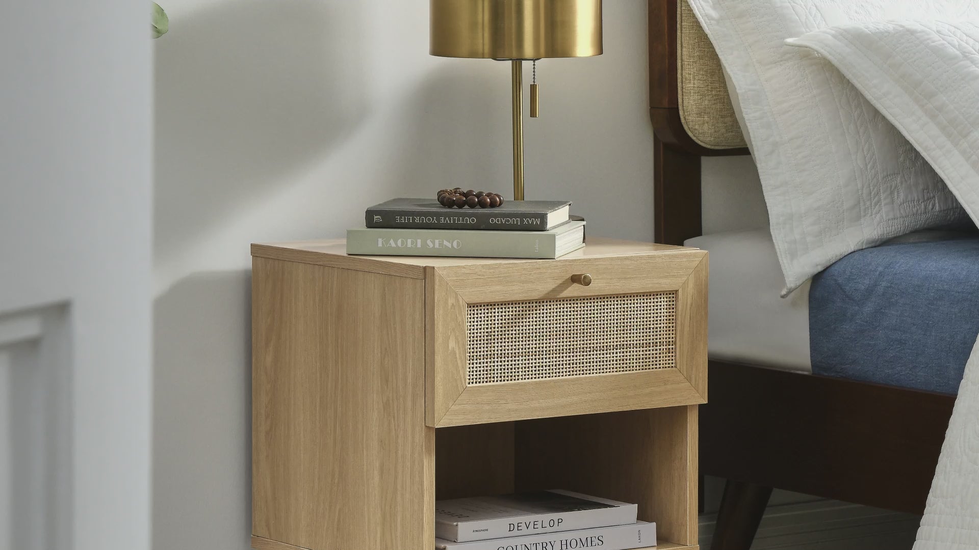 Introduce refreshing style to a primary or guest bedroom with the Soma 1-Drawer Nightstand. Showcasing a beautiful rattan weave on the squared drawer front, this nightstand brings organic aesthetics and modern functionality to a bedroom space or living area when used as a side table. This accent table is crafted from durable MDF and particleboard with a natural wood grain finish. This bedside table is complete with a full-extension glide drawer to help conceal bedside essentials and features an open shelving area that can be used for both storage and display. Resting on splayed legs, Soma includes non-marking foot pads to protect flooring. Assembly required.
