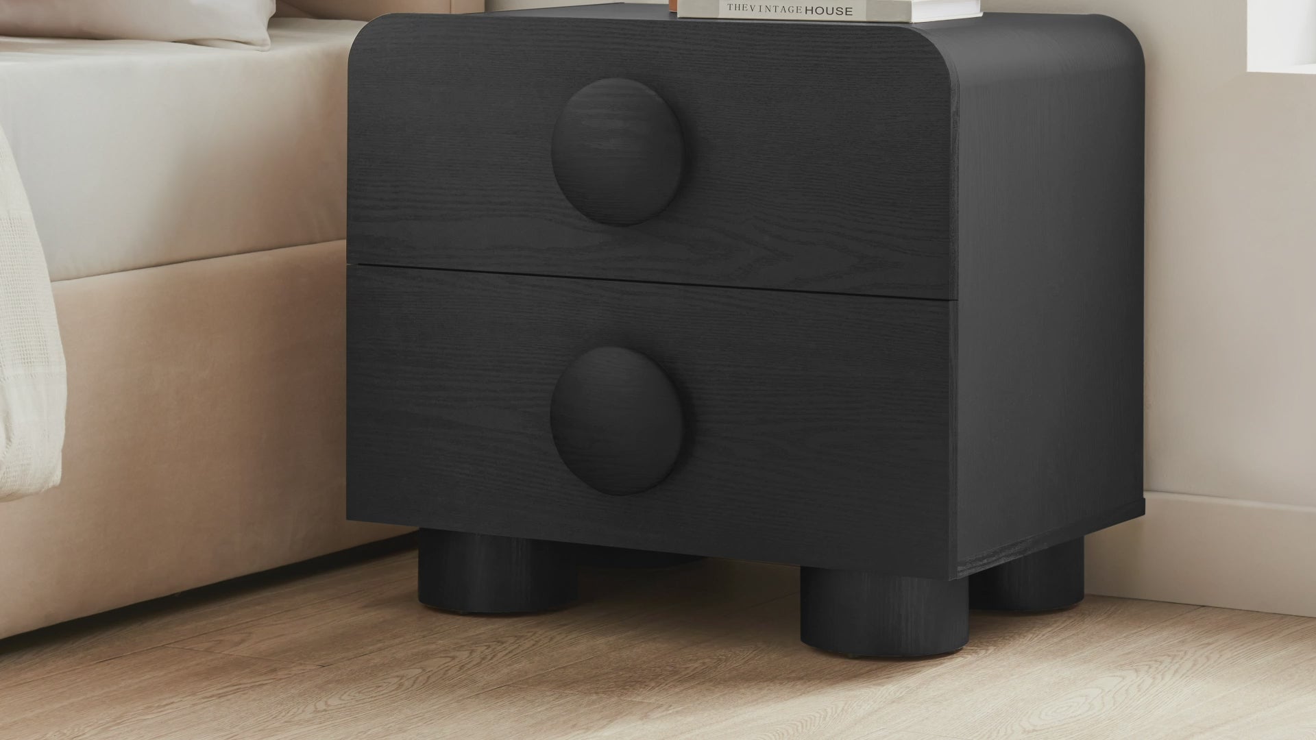 Experience the timeless appeal of the Sonnet Retro Nightstand that combines modern design with practical functionality. This 2-drawer modern nightstand features rounded corners and circular handle pulls that resemble giant buttons, adding a whimsical touch to its sleek aesthetic. Constructed with a durable blend of materials and finished with a wood grain paper laminate, this retro nightstand is both stylish and sturdy. Perfect as a bedside table, Sonnet boasts two spacious drawers that provide ample storage for bedroom essentials, books, home accessories, and more. Versatile in use, Sonnet can complement various décors, making it an ideal modern accent table, side table with storage, or living room end table. Resting on simple legs with non-marking foot glides, this small nightstand with drawers requires assembly. Weight Capacity: 50 lbs.