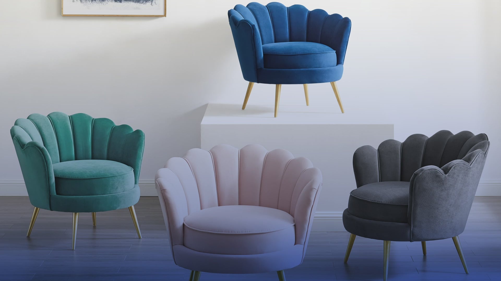 Take a stroll to tranquil waves and ocean's expanse with the Admire Scalloped Edge Performance Velvet Accent Armchair. Scalloped seashell edges and vertical channel tufting create artful elegance in your living room, lounge room, entryway, bedroom, or other seating areas. Showcasing an organic barrel back design, Admire comes with a generously padded round seat for plush comfort. Admire is upholstered in soft, stain-resistant performance velvet upholstery covering dense foam padding and individually wrapped spring coil system. Four tapered and splayed brushed gold stainless steel dowel legs support the glamorous eye-catching elegance of this luxurious accent armchair.