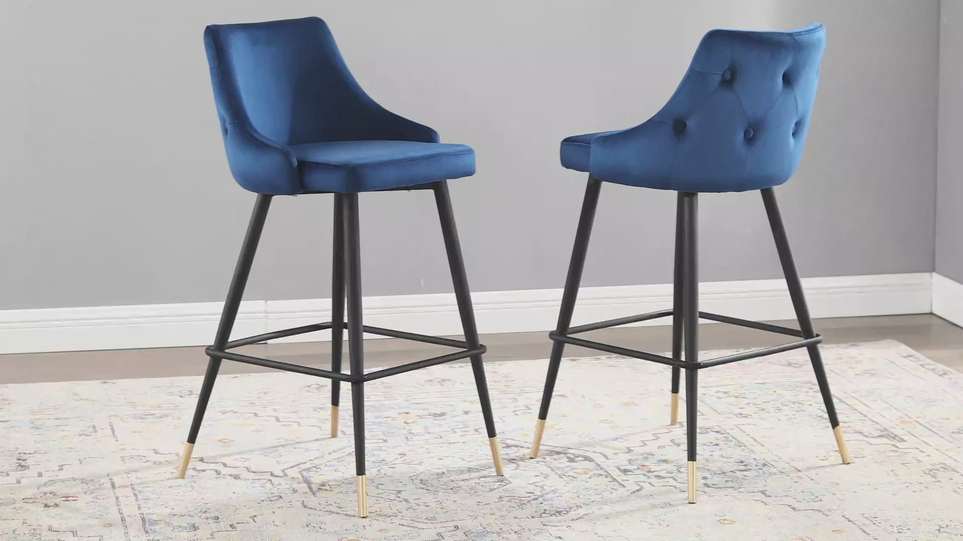 Revitalize dining room or kitchen decor with the Adorn Performance Velvet Counter Stool. Classic button tufting along the stool's exterior and graceful sweeping lines blend seamlessly into the lush comfort of this counter stool. Covered with soft stain-resistant performance velvet, this upholstered counter stool offers a comfortable place to dine with a dense foam padded seat. Sitting on four black tapered legs with gold foot sleeves, Adorn's vintage modern style and glam deco charm makes this counter stool ideally suited for a counter-height bar table or kitchen island, or even as an accompaniment to a drafting desk in the home office. This modern dining counter stool supports up to 300 lbs. and is complete with non-marking foot caps to protect your flooring. No assembly required.