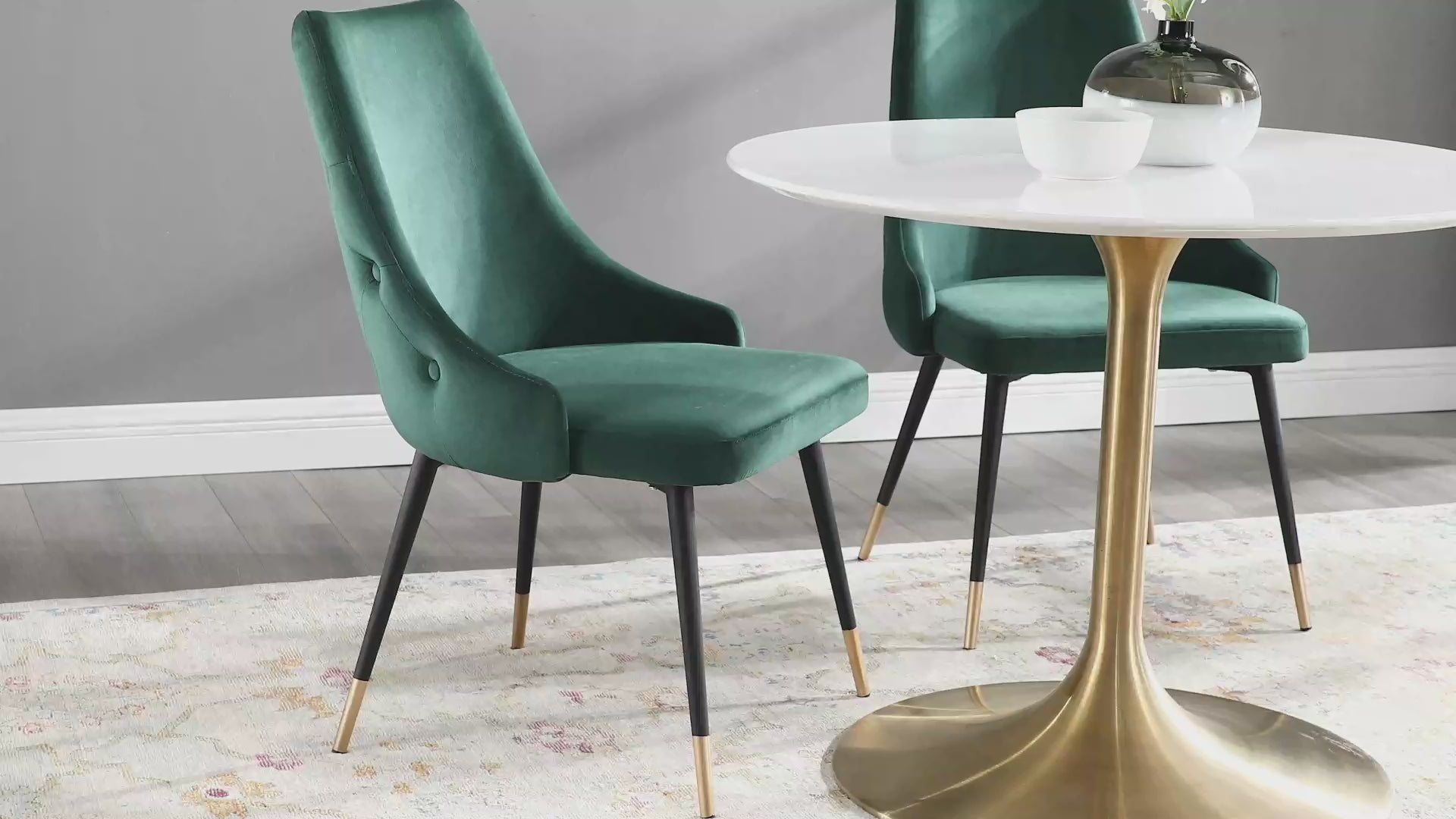 Revitalize dining decor or your living space with the Adorn Tufted Performance Velvet Dining Side Chair. Classic button tufting along the chair's exterior and graceful sweeping lines blend seamlessly into the lush comfort of this dining chair. With soft stain-resistant performance velvet upholstery, this accent chair offers a comfortable place to rest with dense foam padding. Sitting on four black tapered legs with gold foot sleeves, Adorn's versatile vintage modern style and glam deco charm makes this side chair ideally suited for a variety of rooms. Place this velvet chair around the dining table, or use it as an accent chair in the living room, bedroom or entryway, or update your home office seating with use as a cute desk chair. This modern dining chair supports up to 300 lbs. and is complete with non-marking foot caps to protect your flooring. No assembly required.