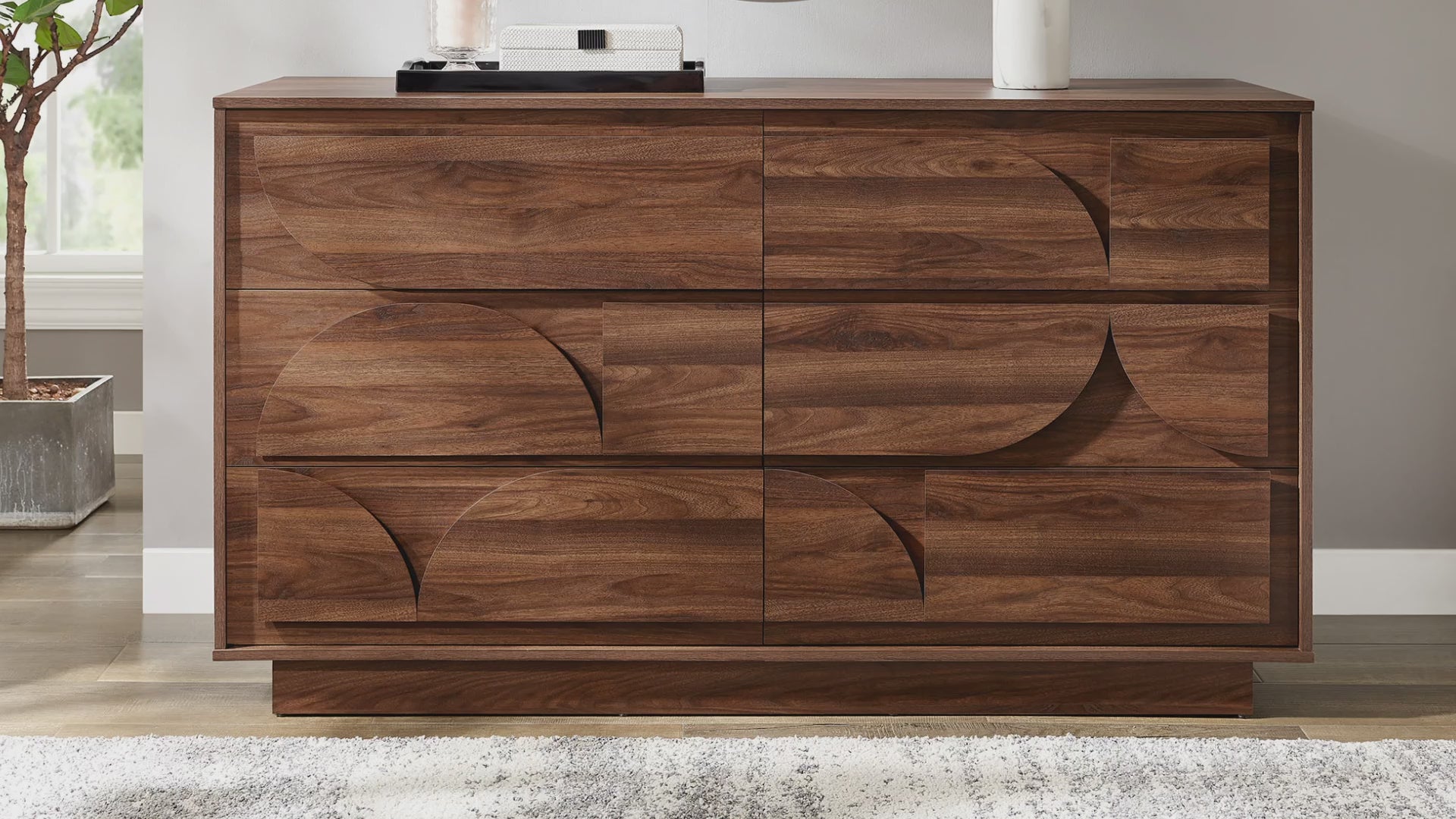 The Bulwark 2-Drawer Nightstand combines modern brutalist design elements with practical storage, making it a standout small table in any space. Featuring a unique half-circle design on the drawer fronts, this bed side table showcases a striking raised circular pattern motif that adds a touch of artistic flair to a primary bedroom or guest bedroom. The plinth base and framed edges enhance its structured look, while the wood grain laminate finish offers a warm, natural appeal. Crafted from durable particleboard, the Bulwark Bedroom Side Table is designed for longevity, with full-glide drawers providing smooth and easy access. Versatile in use, it serves as a perfect modern bedside table or small living room side table with storage. Whether you’re searching for a modern bedside dresser for the bedroom or a storage end table for a reading nook, the Bulwark Nightstand with semi circle drawer design seamlessly combines style and functionality. Assembly required.