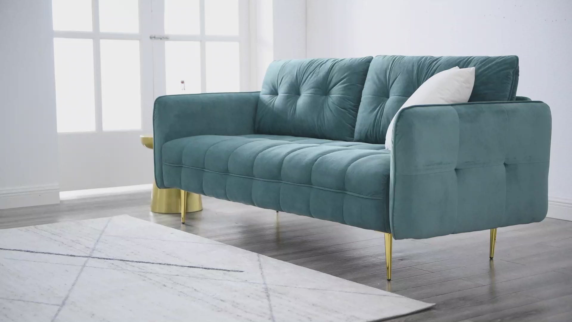 Heighten your living space with the Cameron Tufted Performance Velvet Sofa. Displaying square tufting and French piping detail, this upholstered sofa is rich in glam deco charm and mid-century modern inspiration. Covered in stain-resistant performance velvet, this tufted sofa features dense foam padding and a sinuous spring support system to create a premium seating experience for you and your guests. Sturdily constructed from solid wood, this velvet sofa sits atop polished gold legs with non-marking foot pins. Modernizing the traditional furniture shopping experience, this sofa-in-a-box ships directly to your doorstep in a conveniently portable box with easy-to-follow instructions. This retro modern sofa is an ideal addition to your living room, lounge room, or home office. Assembly required. Sofa Weight Capacity: 900 lbs.