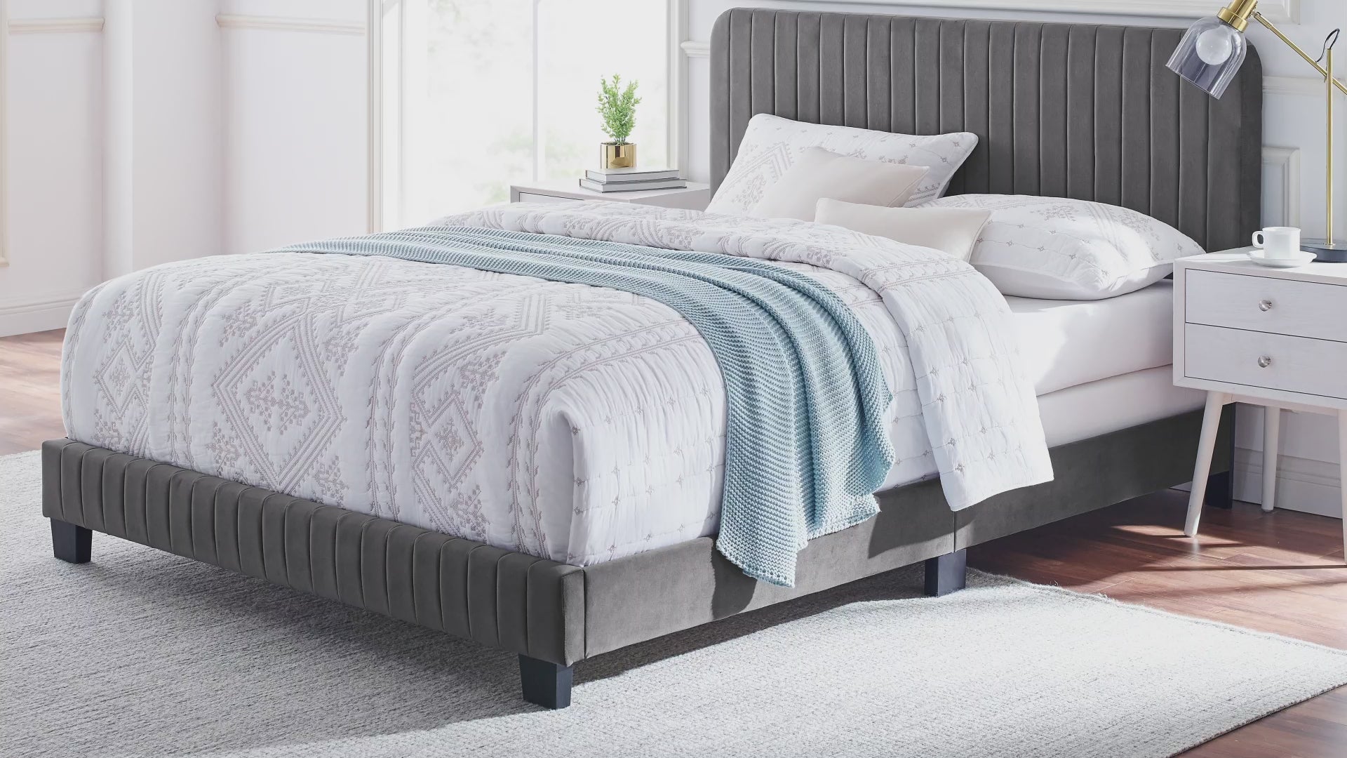 Elevate your master bedroom or guest bedroom style with the luxe texture and glam deco elegance of the Celine King Bed. Adorned with channel tufted detail, the king size headboard of this upholstered bed is padded in dense foam to offer supportive comfort while sitting up resting, relaxing, reading, or watching TV. Upholstered in stain-resistant performance velvet, this king size bed features support legs for added durability. A sturdy mattress foundation, this king size bed accommodates a variety of mattress styles including innerspring, memory foam, and latex with the use of a box spring. Assembly required. Weight Limit: 900 lbs.