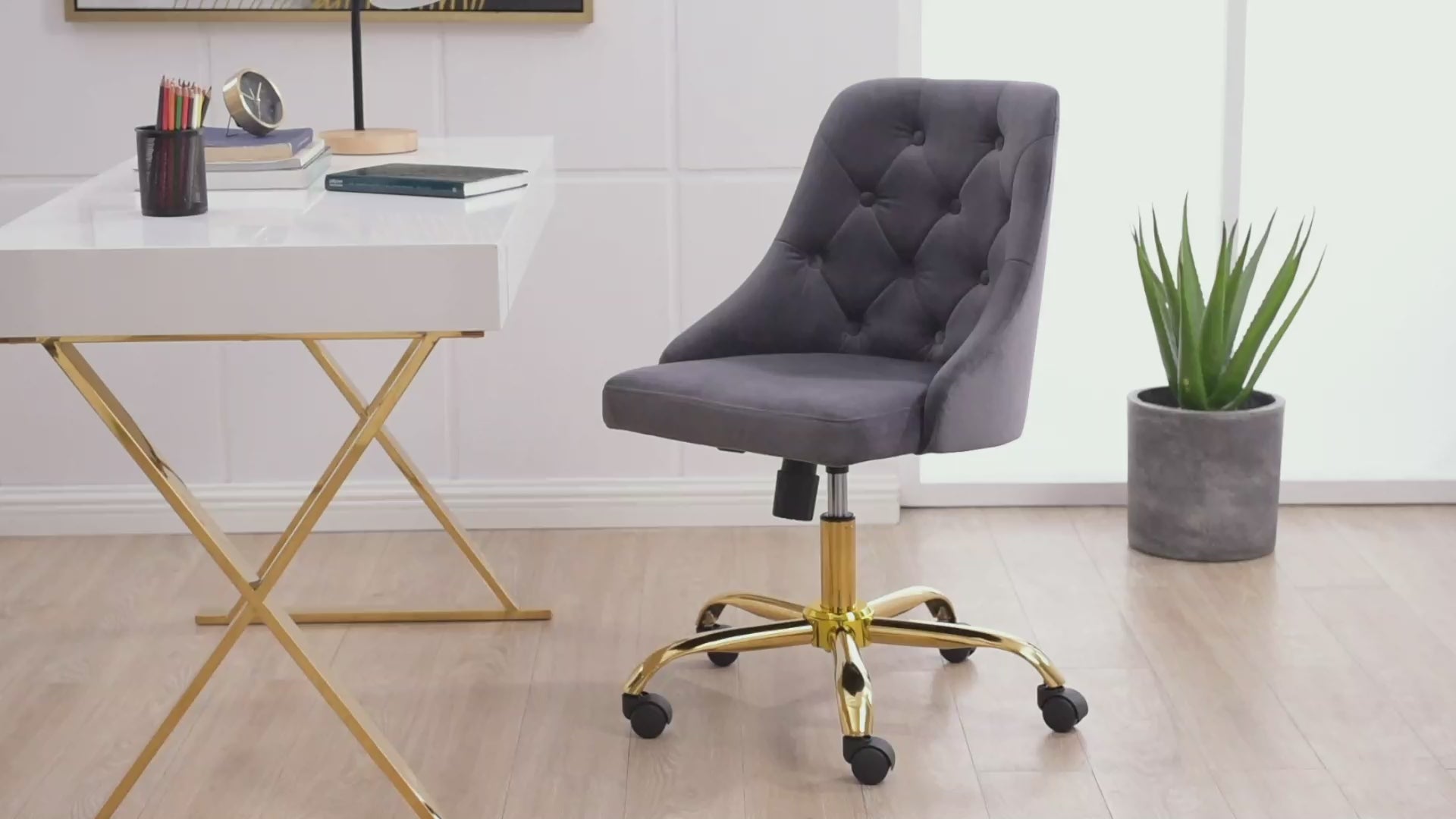 Introduce glam deco style and vintage modern elegance to your home office with the Distinct Tufted Performance Velvet Office Chair. Featuring gold metal accents and beautiful button tufting, this desk chair is padded in dense foam and upholstered in soft, stain-resistant performance velvet offering a supportive, comfortable place to sit during the workday. A chrome gold base and five dual-wheeled nylon casters provide easy movement over hardwood or carpeted surfaces while the full 360-degree swivel, tilt tension control, and pneumatic height adjustment create a custom seating experience. Perfect for the modern home or office, this office chair is a desirable addition to any workspace. Chair Weight Capacity: 220 lbs.