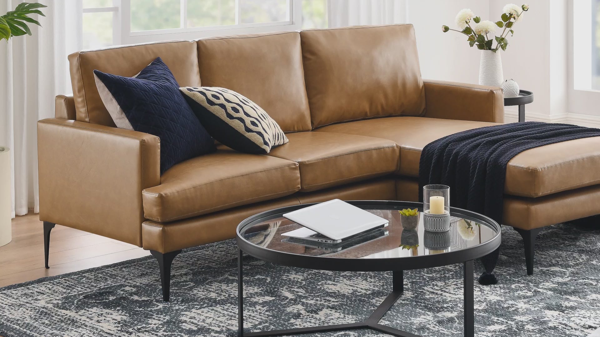 Abounding in luxe modernity, the Evermore Vegan Leather Sofa delivers tailored elegance, rich texture, and a deep, comfortable seat to your living room, bedroom, lounge room, or home office. This upholstered three-seat sofa is covered in smooth and durable vegan leather and padded in dense foam to offer a premium seating experience. The cushions are removable and feature zippered covers for easy cleaning. Resting on metal legs with non-marking foot pads, this vegan leather upholstered couch makes a glam deco statement in the modern home or apartment. Assembly required. Weight Capacity: 992 lbs.