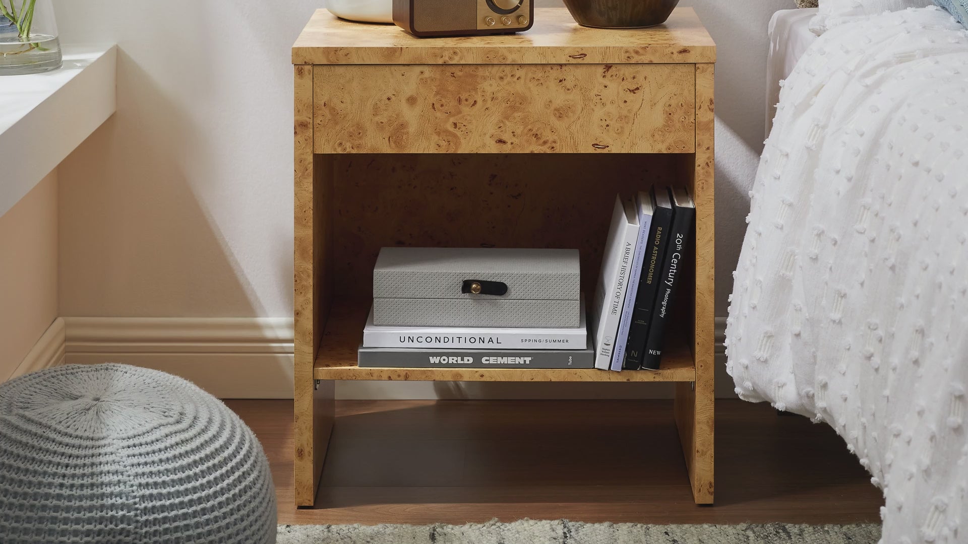 Hudson 1-Drawer Burl Wood Nightstand With Shelf