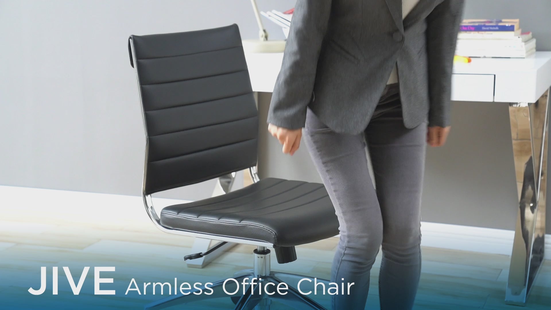 Steer the course and sail to an island called style. Jive is the result of chair makers who decided to design a chair that just works. Functionally, it is a pleasure to sit in as the durable ribbed vinyl back provides natural posture support. The seat cushion comes well padded, while the armless construction makes this a perfect piece for conference rooms and desk work. Jive’s chrome-plated aluminum base is fitted with five dual-wheel casters, while a tension knob and tilt lock allow for easy back position adjustments. This is a chair made for the modern office and a welcome embodiment of the spirit of progress and determination.