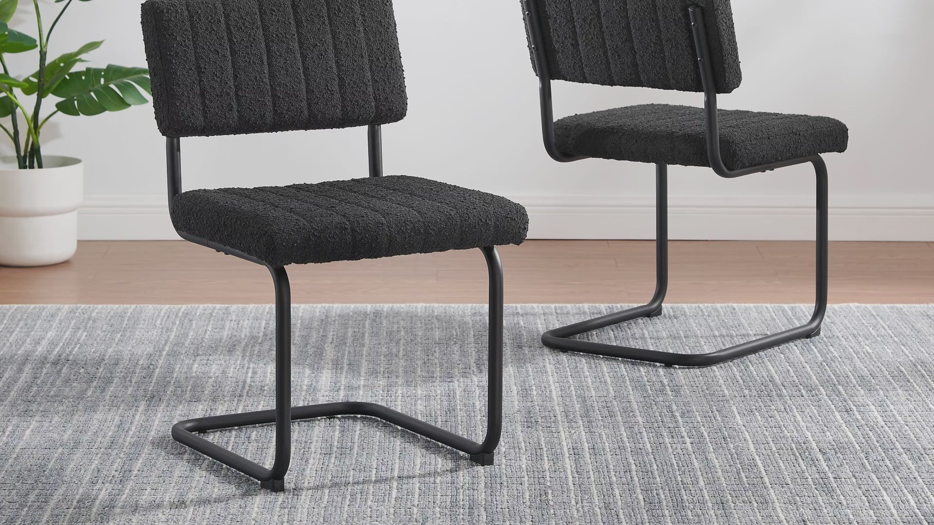 Bring mid-century style to your dining space with the Parity Dining Chairs - Set of 2. These side chairs feature smooth vegan leather upholstery that is channel tufted for a retro modern look. The powder-coated tubular metal sled bases provide a sleek silhouette and superior durability with a weight capacity of 330 lbs. These dining chairs are equipped with non-marking foot pads to protect flooring and dense foam padding for added comfort and support. With both retro modern and vintage style, this set of two dining side chairs brings a unique flair to your dining room, kitchen space, or living area. Assembly is required.