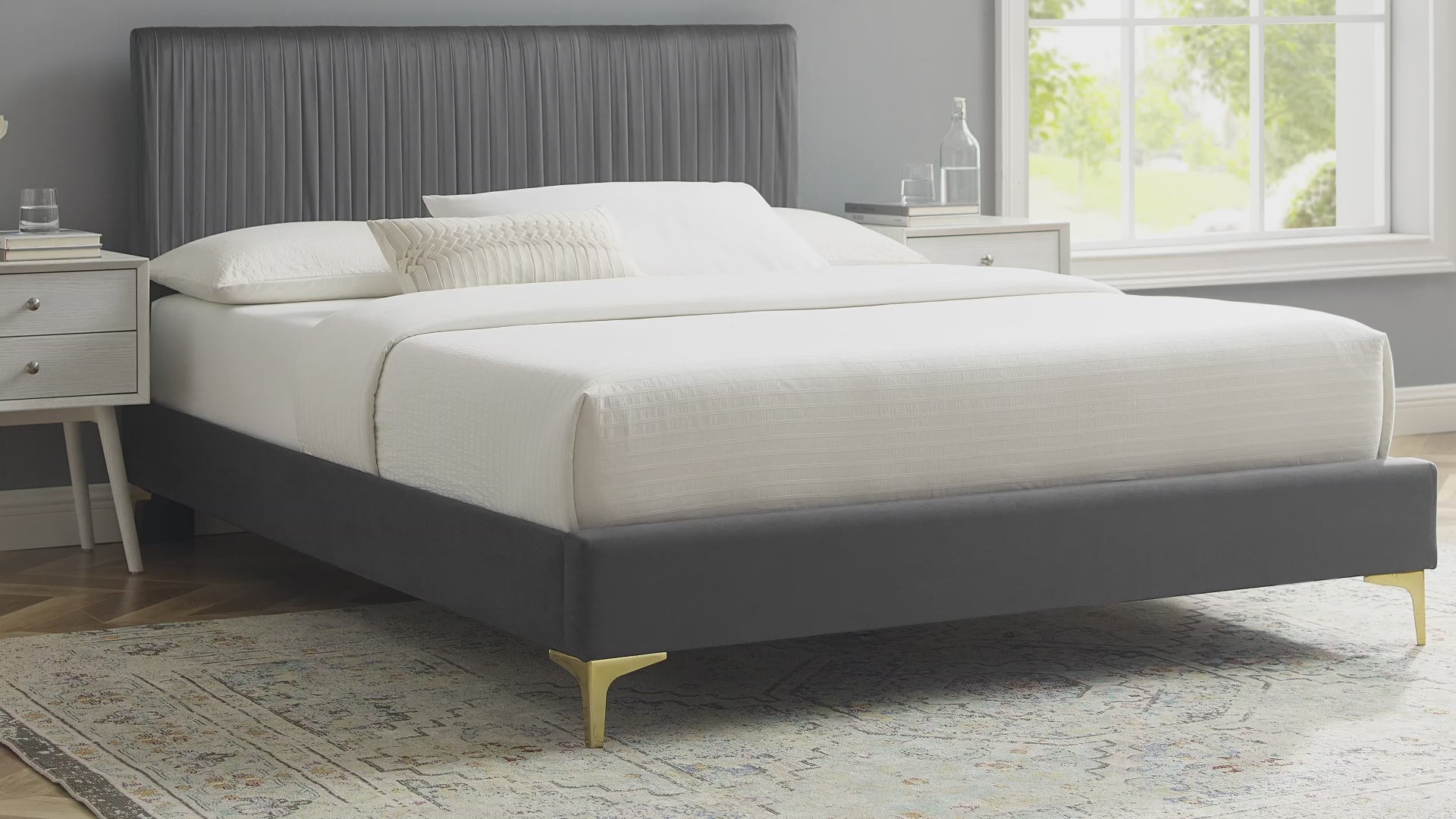 Reimagine master bedroom or guest bedroom decor with the Peyton Channel Tufted Performance Velvet Queen Bed. Rich in vintage modern elegance and glam deco style, the queen headboard of this platform bed features retro channel tufting, luxe velvet texture, and dense foam padding to offer a supportive place to rest while sitting up in bed. A queen size bed covered in stain-resistant performance velvet, this platform bed is a sturdy mattress foundation for memory foam, innerspring, latex, and hybrid mattresses. Eliminating the need for a box spring, the MDF frame of this queen bed is complete with a wood slat support system crafted with poplar for lasting durability and support. This slatted bed frame rests on gold metal legs with non-marking foot caps and includes a reinforced center beam with two support legs for enhanced stability. Assembly required. Weight Capacity: 800 lbs.