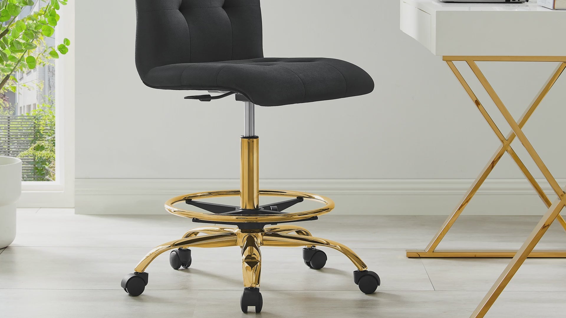 Etiquette presides over the properly styled Prim Armless Drafting Chair. Modern and luxurious, this swivel drafting stool features deep biscuit tufting, stain-resistant performance velvet upholstery, and elegant piped trim for added finesse. This velvet drafting-height office chair is height adjustable, features a 360º swivel, and comes outfitted with a gold metal base with five dual-wheel nylon casters. Perfect for standing desks, drafting tables, reception desks, and more, Prim is complete with dense foam padding for lasting comfort throughout the workday. Assembly required. Weight Capacity: 287 lbs.