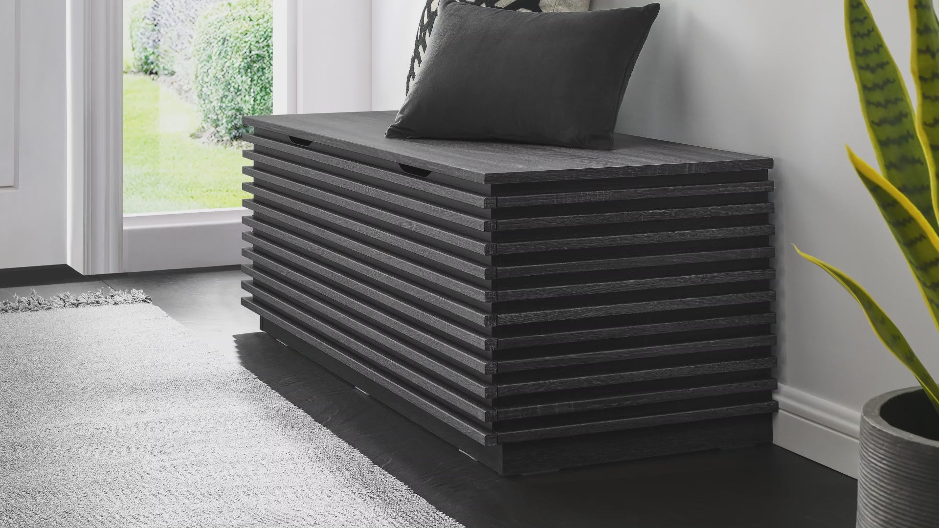 Tap into mid-century aesthetics with the Render Storage Bench. This installment of the Render collection features a durable particleboard frame with a smooth wood grain laminate and retro slatted detail. With a hinged top, this versatile accent bench features a solid construction with a pleasing look and practical functionality. Perfect for the living room, bedroom, entryway, or mudroom, this 47" bench offers ample storage space for linens, clothes, blankets, or whatever else suits your needs. Includes cutouts as a safety measure. Assembly required.