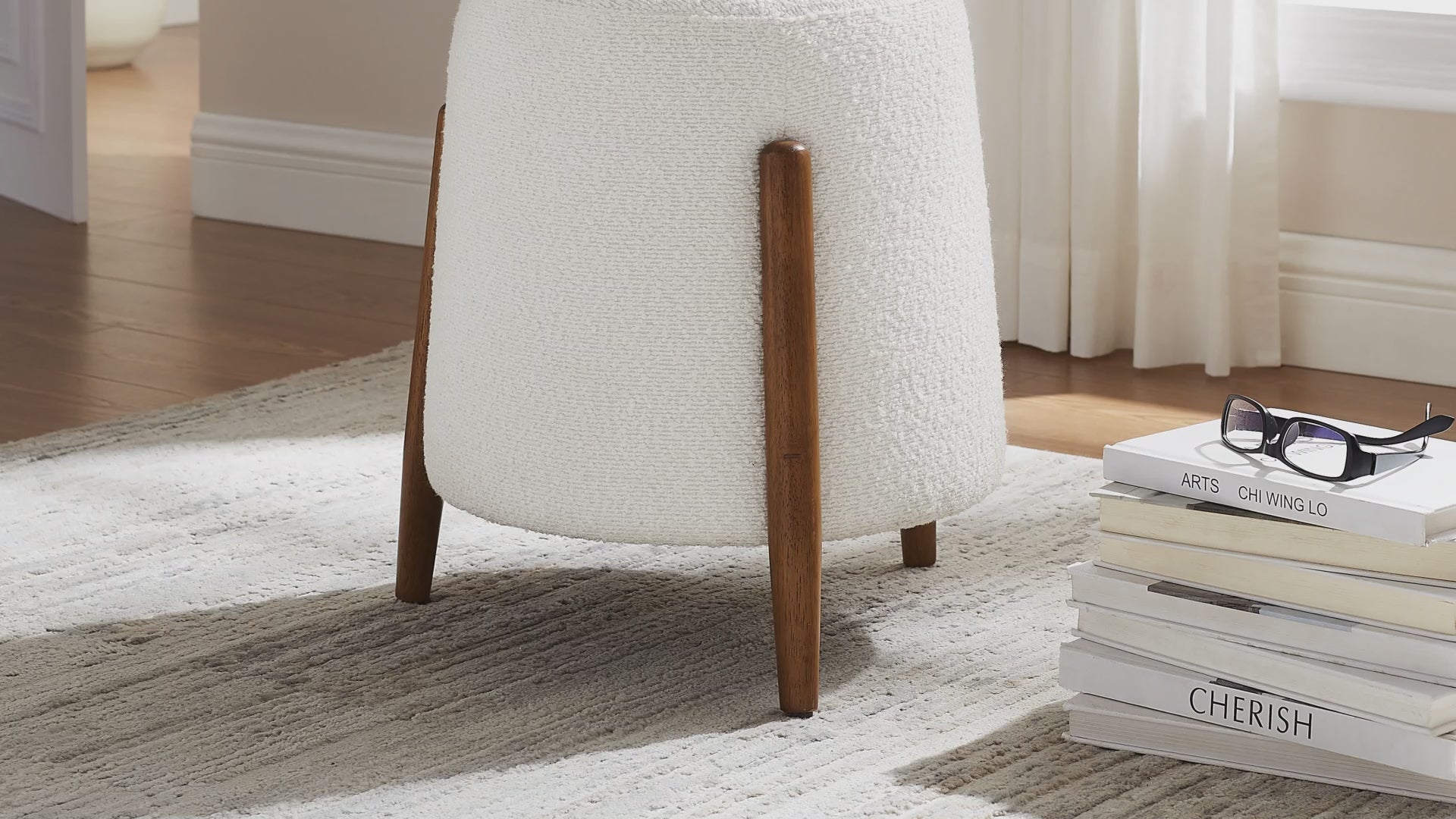 Immerse your living space in the sophisticated comfort of the Riven Ottoman. Upholstered in textured boucle fabric, this foam-padded, round ottoman stool radiates an air of elegance with a hint of modern panache. With its gentle curves and soft silhouette, this foot pouf ottoman stands on three tapered wood legs, elegantly affixed to the exterior of the footrest, providing a stable foundation while enhancing the piece’s overall shape with their sleek, splayed design. Whether it's accompanying your favorite armchair as a charming ottoman side table, used as an elegant vanity stool, or acting as a decorative ottoman in your living room, Riven's petite stature is designed to fit into any decor, offering a multifunctional ottoman for everyday needs. Celebrate the seamless blend of texture and form with this exquisite boucle ottoman, bound to become a cherished addition to your home furniture collection. Assembly Required. Weight Capacity: 264 lbs.