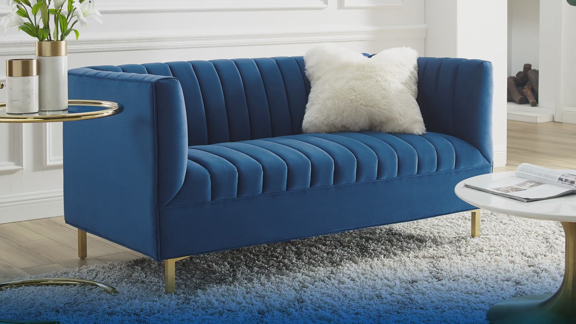 Engage the flowing lines of the Shift Channel Tufted Performance Velvet Living Room Loveseat for a subtle elegance that enhances your living room decor. Shift features interior vertical channel tufted details that adds visual depth to this glam deco two-seater couch. Luxuriously soft and stain-resistant performance velvet upholstery covers this living room loveseat for an elegant piece at home in your living room, lounge room, or office seating area. The Shift Velvet Loveseat rests securely on four gold stainless steel legs with non-marking foot pads to protect flooring. Assembly Required. Loveseat Weight Capacity: 600 lbs.