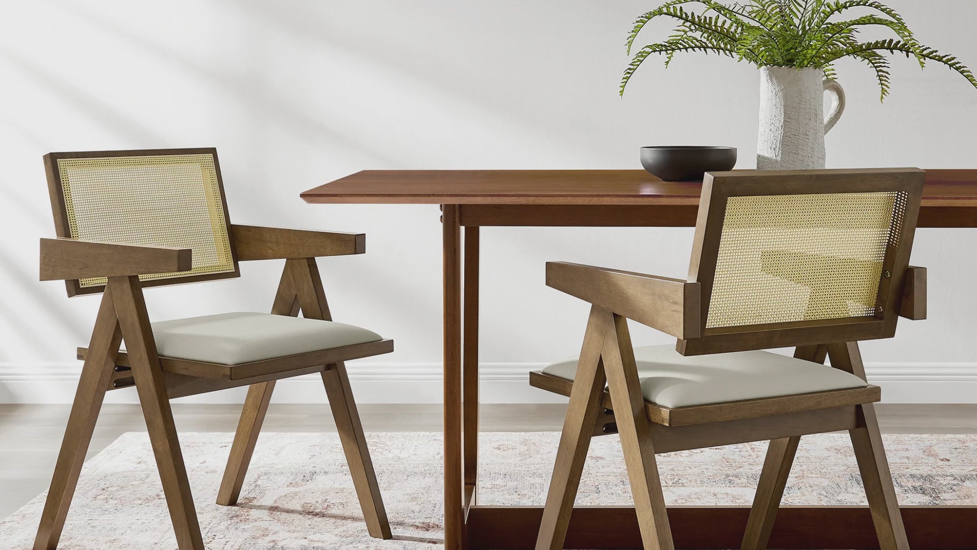 Update your interior decor with the modern allure of the Thera Set of 2 Rattan Accent Chairs. Crafted with durable rubberwood frames, these wood accent chairs seamlessly blend retro design with modern aesthetics, making them a stylish choice for your bedroom, living room, lounge area, home office, entryway, hallway, or reading nook. Featuring plush, removable faux leather seat cushions and full-length breathable rattan cane backs, the Thera mid-century modern accent chairs offer a harmonious blend of textures and comfort. The outward-extending legs of these rattan chairs provide stability, while the comfortably angled seats enhance relaxation. Whether used as home office reception chairs or as vegan leather living room chairs, the Thera cane accent chairs bring modern flair to any setting. Assembly required. Weight Capacity: 507 lbs.
