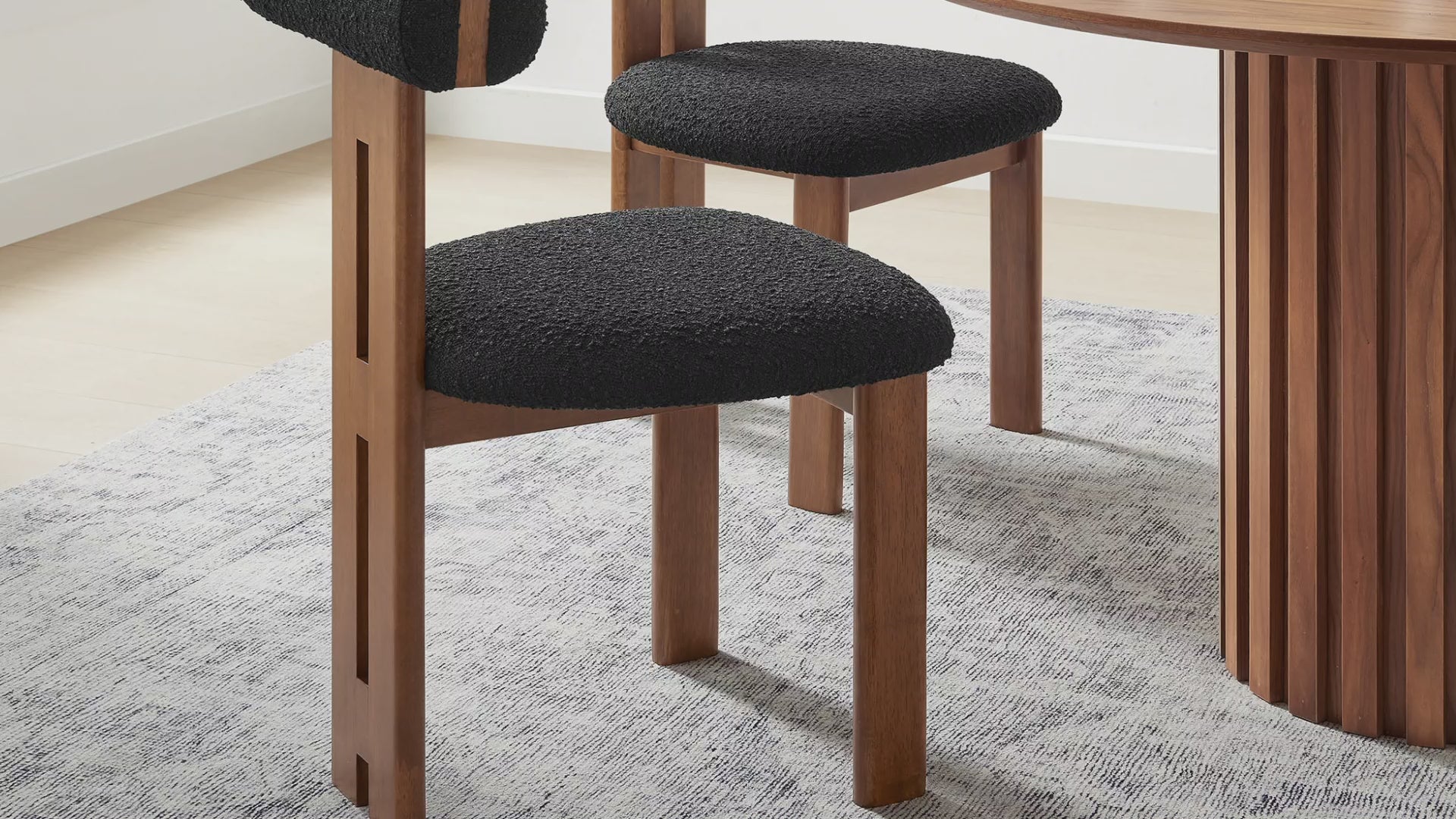 Bring a chic and sophisticated look into your home with the Modway Torian Upholstered Dining Chair Set of 2. Constructed with high-quality rubberwood, these armless dining chairs feature a 3 legged design. The centered back leg, with its unique artistic cutout and double-beamed back, extends upward to join with a rolled backrest upholstered in textured boucle fabric. With matching boucle seats, these padded dining room chairs with 3 legs and sleek vertical lines blend seamlessly to create a striking retro-modern appeal. No matter where you place them - whether in the dining room, kitchen, or living room, the Torian Set of 2 Accent Chairs offer plush, cozy seating that balances comfort and style. With simple assembly required and foot pins included to protect your floors, these boucle dining chairs blend farmhouse aesthetics with modern design.