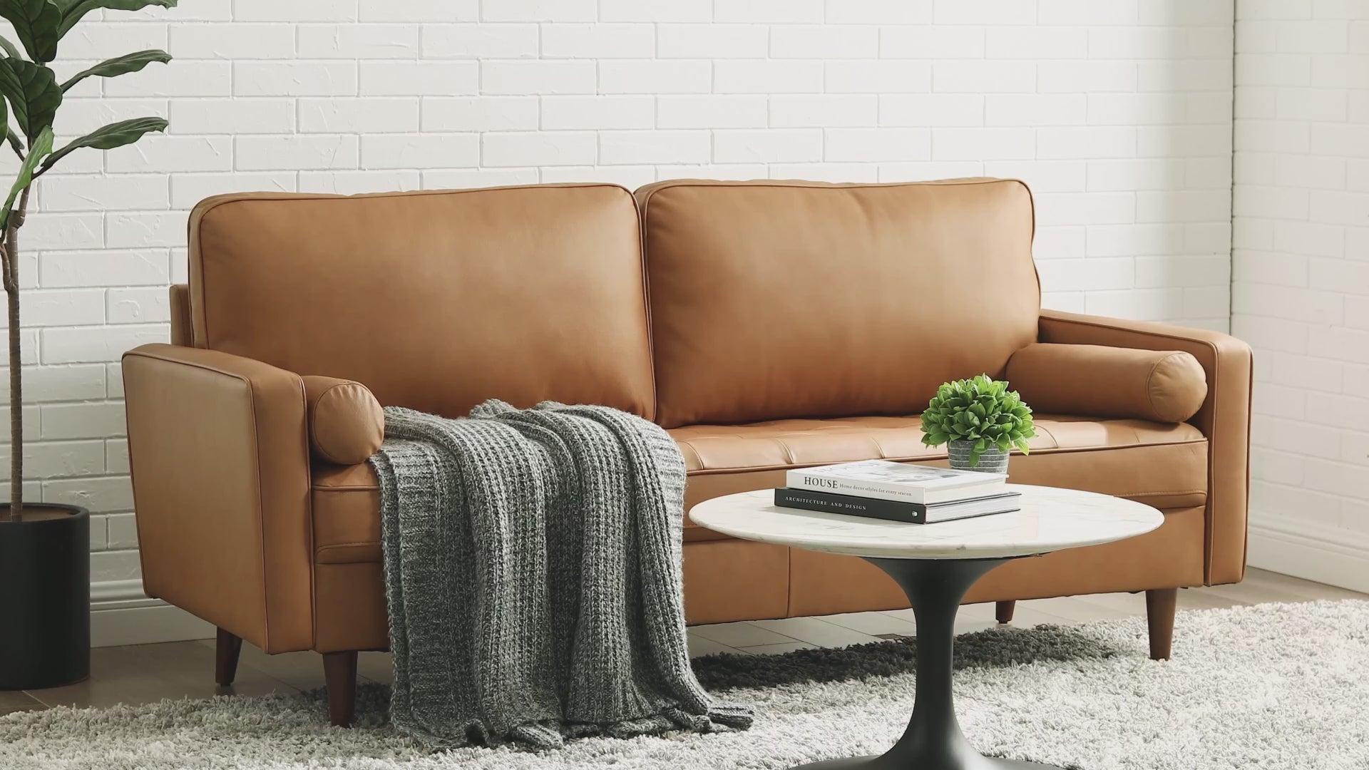 Update your home or apartment with the mid-century style and modern-day convenience of Valour. This comfortable living room sofa features a tailored profile with elegant biscuit tufting and two bolster pillows. Covered in beautiful top grain leather upholstery, Valour has dense foam padding, an innerspring pocket structure, and sinuous spring support for a comprehensive seating experience. This luxe modern sofa comes with walnut-stained wood legs with non-marking foot caps and supports up to 900 lbs. Say goodbye to the days of hauling heavy furniture. This tufted sofa ships in a portable box for easy maneuvering.