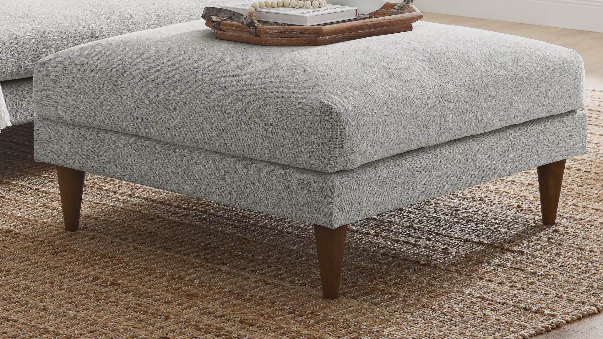 Put up your feet and sink into comfort with the Zoya Upholstered Down-Filled Ottoman. The perfect addition to modern living rooms, family rooms, or game rooms, Zoya comes upholstered in polyester fabric with a down blend and dense foam filling and provides a soft, cloud-like sensation that retains its shape. Featuring a single plush cushion, this square ottoman delivers a lounging experience optimized for comfort. The convenience of the removable and washable cushion makes maintenance a breeze. Underneath a lavish exterior, Zoya integrates pocket springs, which offer added support, and comes perched on sleek tapered rubberwood legs and set on a solid wood frame. Whether you're settling in for a movie or diving into a good book, the Zoya Fabric Ottoman is the perfect spot to kick up your feet and indulge in luxury. Comes equipped with non-marking foot caps. Assembly required. Weight capacity: 600 lbs.